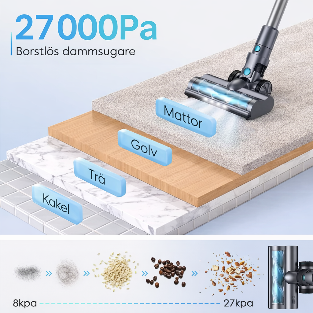 Upplev kompromisslös rengöring med upp till 27 000 Pa kraftfull sugförmåga. Den borstlösa motorn suger effektivt upp allt från fint damm till större smutspartiklar – oavsett om du städar mattor, trägolv, kakel eller hårda golv.