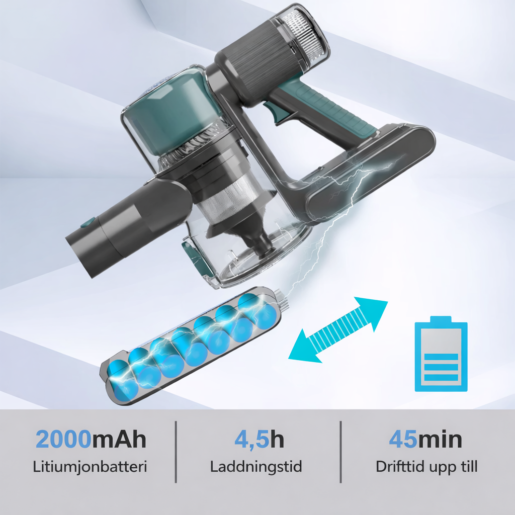 Med ett kraftfullt 2000 mAh litiumjonbatteri får du upp till 45 minuters drifttid, vilket gör dammsugaren perfekt för snabbstädning i hemmet, bilen, husvagnen eller kontoret. Den kompakta och sladdlösa designen gör den enkel att ta med och använda precis när behovet uppstår – utan att leta efter eluttag.